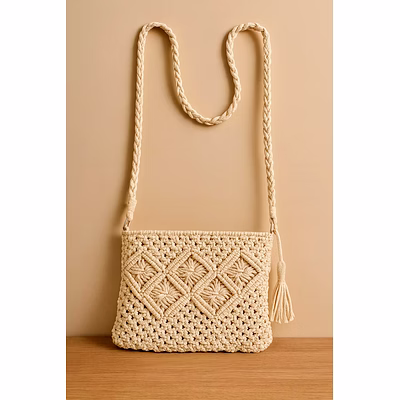 This off white macramé crochet bag is a handmade cotton crossbody purse designed for wholesale and export distribution. Crafted by skilled artisans using traditional macramé techniques, the bag is woven from 100% natural cotton cord with detailed knot patterns that enhance durability and texture. Its neutral off white tone offers wide market appeal, making it suitable for contemporary and casual fashion assortments. Developed for bulk buyers, this crochet purse combines sustainable materials with functional everyday use.